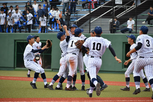 [写真/勝利の瞬間。マウンドに集まり、全道大会出場を喜ぶ別海ナイン ]