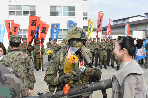 [写真/徽章と花束を受け取り同僚や家族にたたえられる隊員 ]