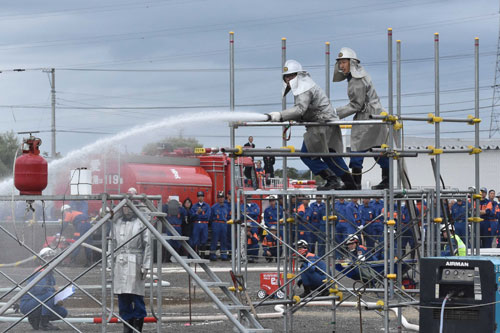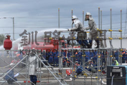 [写真/仮設の高台から放水して的に当てる出場者 ]