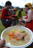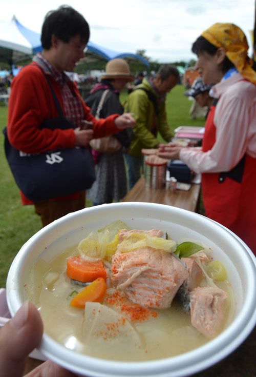[写真/秋サケがたっぷり入ったあきあじ鍋を求める来場者 ]