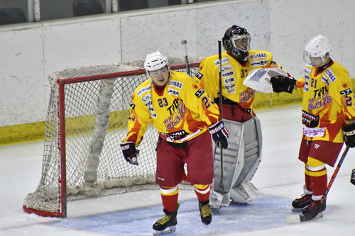[写真/【スケートハウス札幌―釧路東部ブレイズ】第3ピリオド16分、ハットトリックを達成した釧路東部ブレイズの佐藤佑(左) ]