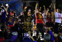 [写真/解散発表後、会場と一体でモットーを唱和するサムソン宮本代表(中央)ら新根室プロレスのメンバー ]