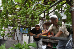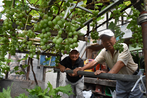 [写真/たわわに実ったブドウを前に佐藤さん(右) ]