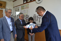 [写真/千葉会長から雑巾を受け取る土江田校長(右) ]