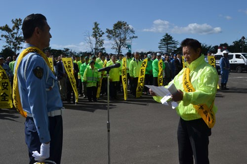 [写真/交通安全宣言書を読み上げる市建設事業協会の穂積委員長 ]