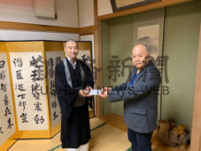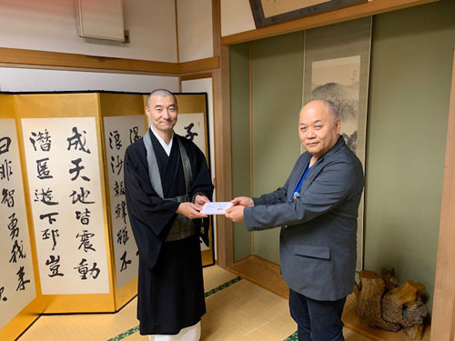 [写真/お米券を手渡す石割会長(右) ]