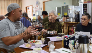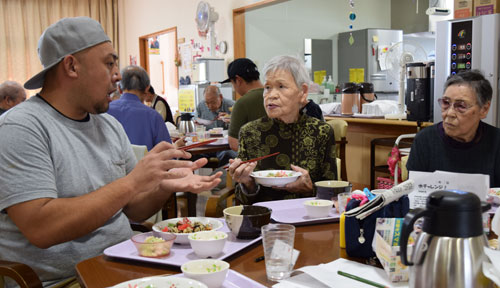 [写真/一緒に昼食を食べながら親睦を深める司口部長(左) ]