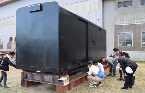 [写真/さびも落とされ、きれいになった貨車を眺める参加者 ]