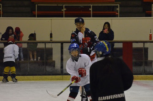 [写真/ひたむきにプレーする子供たちを見守り、アドバイスする西脇選手 ]