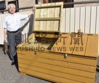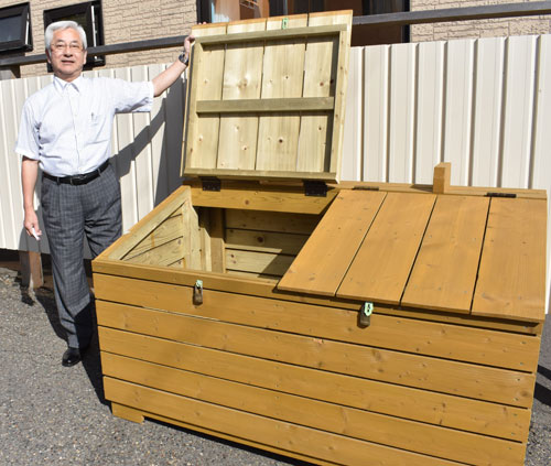 [写真/私費を投じて製作した資源ごみ回収ボックスと村井副会長 ]