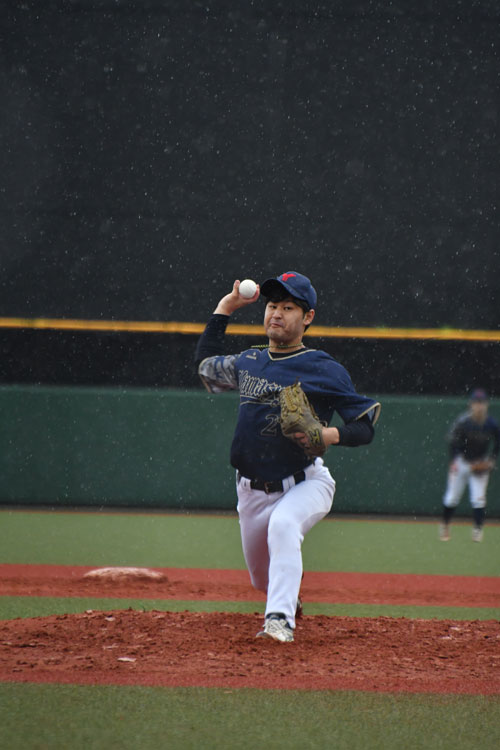 [写真/【2部決勝、Nakagawa Brex―山本商事野球クラブ】6回から2番手で登板した山本商事野球クラブの滝本。雨にも負けず粘投 ]
