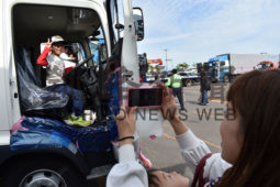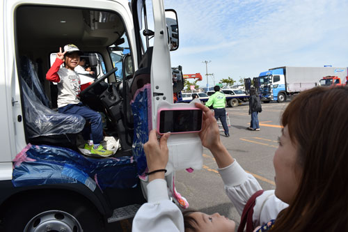 [写真/展示されたトラックで記念撮影する親子 ]