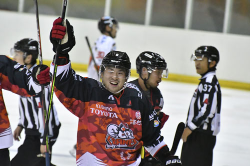 [写真/開幕5試合で4得点のFW入倉選手。ゴール後、ファン、スポンサーにアピール(2日、釧路) ]