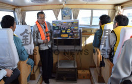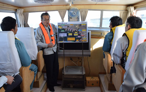 [写真/パネルを使って港湾周辺の施設について説明する田川所長(左から2人目) ]