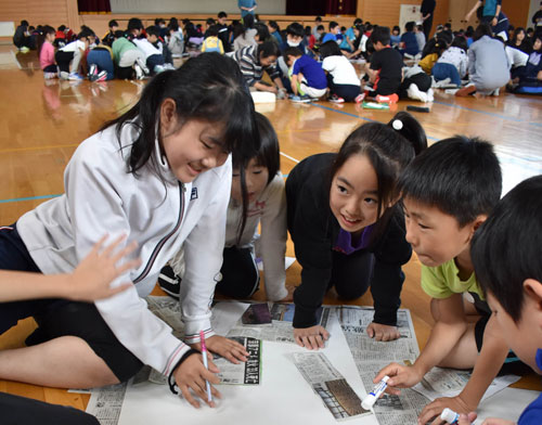 [写真/読んで気になった記事を壁新聞に貼り付ける児童 ]