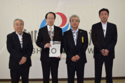 [写真/伝達式に臨んだくしろバスの畑毛正文参事と名塚副市長、橋本支局長、阿寒バスの須田広伸次長(左から) ]
