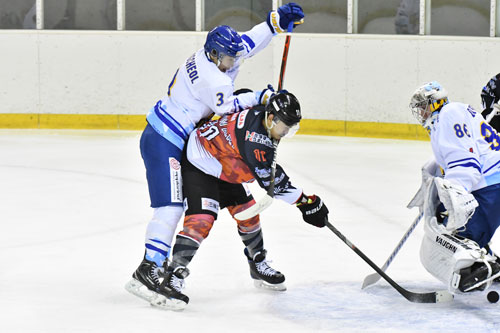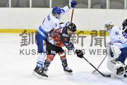 [写真/【ハルラ―ひがし北海道】第1ピリオド12分、相手の強い当たりにも倒れず、同点弾を沈めるひがし北海道クレインズのFW西脇(中央) ]
