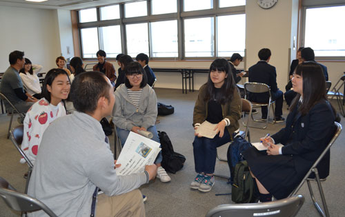 [写真/5業種の職業人を囲み、熱心に対話した高校生ら ]