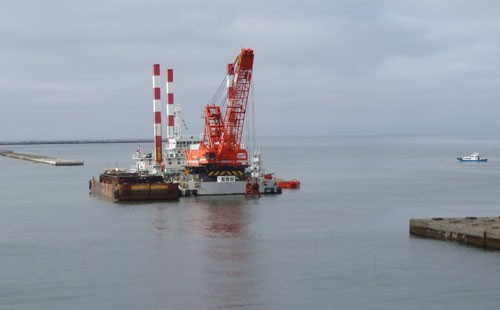 [写真/沖と陸から延伸させている防波堤に、ケーソンを据え付けるための準備作業 ]