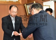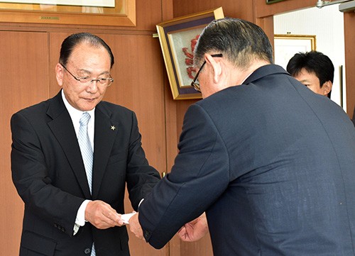 [写真/義援金を手渡す歯舞漁協の小倉組合長 ]