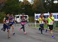 [写真/旧厚床小学校前を一斉にスタートする出場チームの第1走者 ]