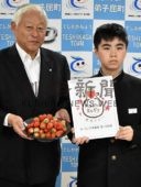 [写真/舘さん(右)と徳永哲雄町長。町のシンボルをあしらったロゴマークもデザイナーに依頼して製作した ]