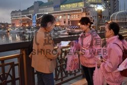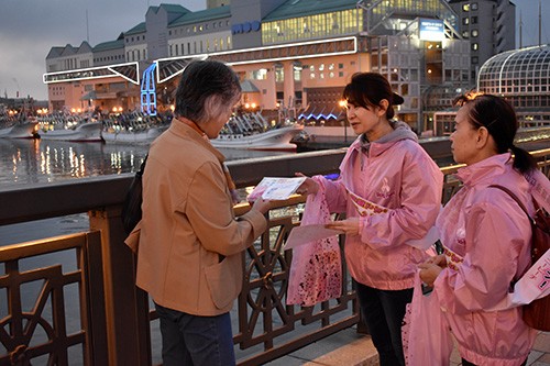 [写真/通行人に啓発グッズを配るシャイニーピーチの会員 ]