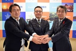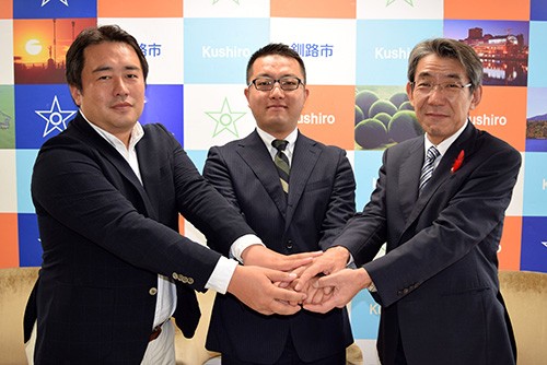 [写真/2000件の相談対応を目標に掲げ、手を重ねる澄川センター長、田辺ブランディングマネジャー、蝦名市長(左から) ]