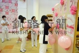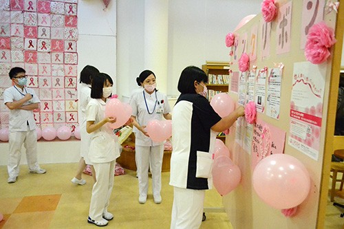 [写真/ピンク色の風船などを飾り付ける病院スタッフたち ]