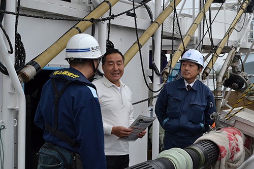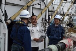 [写真/釧路港に停泊する漁船に海難事故防止を訴える海保職員ら ]