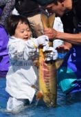 [写真/保護者の大きな声援が飛ぶチビッコ秋サケつかみどり(2017年の様子) ]