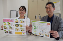 [写真/キャンペーンへの参加とサポートレストラン登録を呼び掛ける友原さん(左)と川上禎之課長 ]