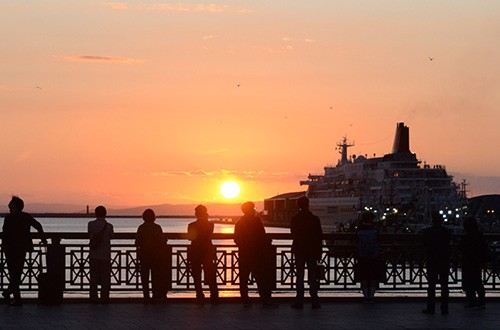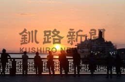 [写真/「にっぽん丸」が来港した9月27日は多くのファンが夕日とのコラボ写真撮影に集まった ]