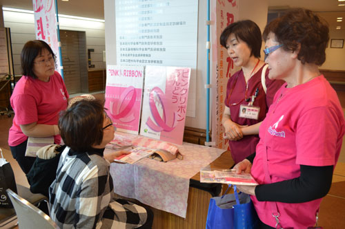 [写真/乳がん検診の重要性を伝えるシャイニーピーチの畑野会長(左)と釧路労災病院の職員ら ]