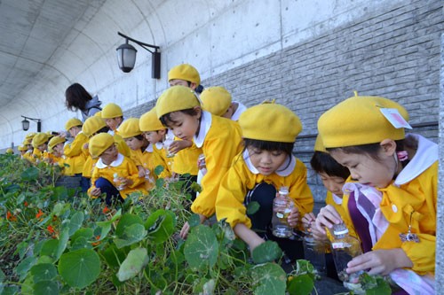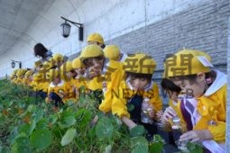 園児、富士見坂のキンレンカ種採り(2019-10-10)