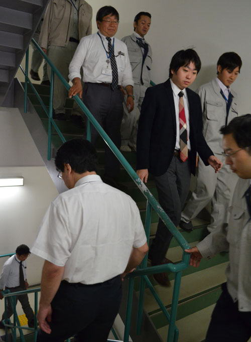 [写真/非常階段から1階へ避難する職員 ]