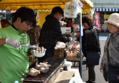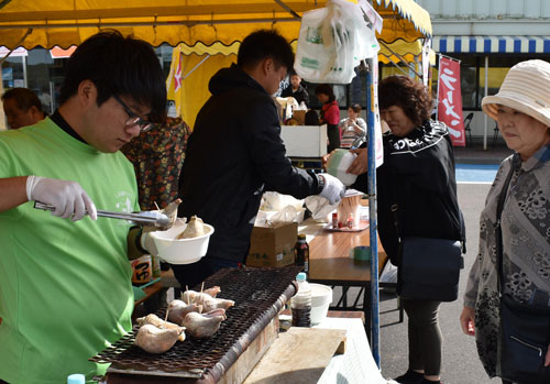[写真/熱々のツブ焼きを購入する来場者 ]