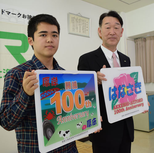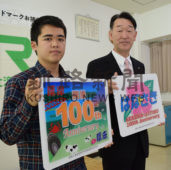 [写真/ヘッドマークを手に和田さん(左)と萩原支社長 ]