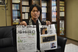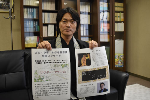 [写真/「耳なし芳一」の公演をPRする菅原住職 ]