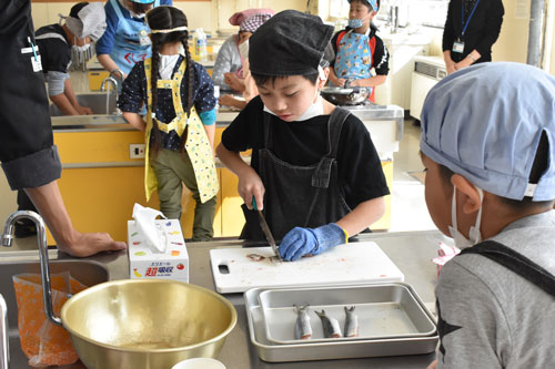 [写真/マイワシをさばく児童ら ]