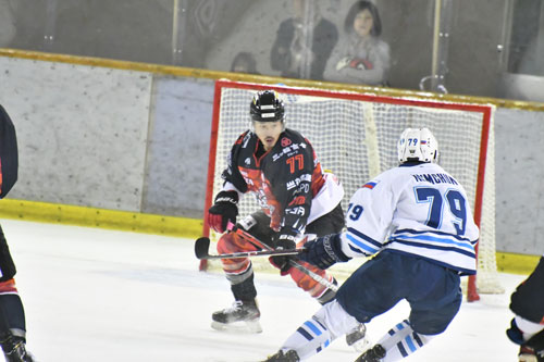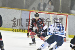 [写真/【サハリン―ひがし北海道】第3ピリオド19分、無人のゴールを体を張って守ったひがし北海道クレインズのDF梁取 ]