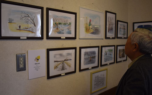 [写真/オキノさんのイラスト作品が並ぶ会場(港文館) ]