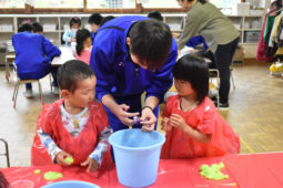 [写真/スライム作りを通じて触れ合う生徒と園児 ]
