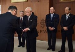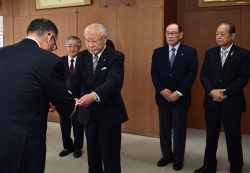 [写真/台風19号被災地への義援金を手渡す市町連の長谷川会長ら ]