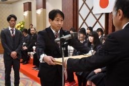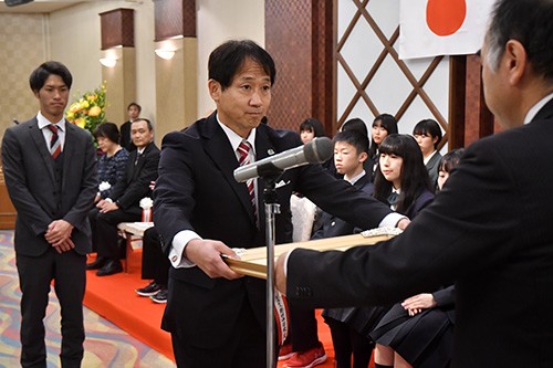 [写真/賞状を受け取る別海野付中の飯田校長 ]