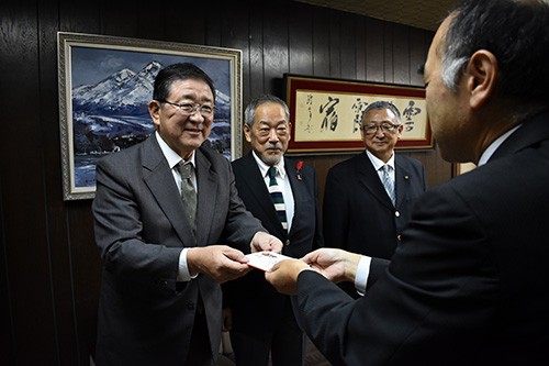 [写真/拠出金を手渡す栗林会長(左)ら ]