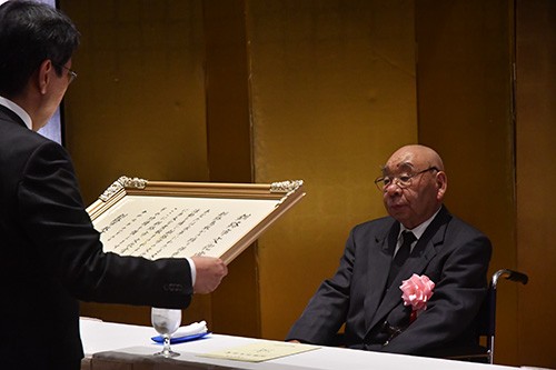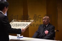 [写真/岡部教育長から賞状を受け取る保存会の菅原会長 ]