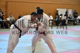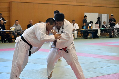 [写真/【個人戦二段以上の部決勝、菊地心―宮本孝介】激しい組手争いをする両者 ]