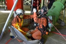 [写真/マスクや酸素ボンベなどを装備しサイロ内に救出へ向かう救急隊員 ]