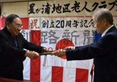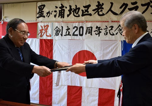 [写真/大手副会長(左)に感謝状を手渡す穂刈会長 ]